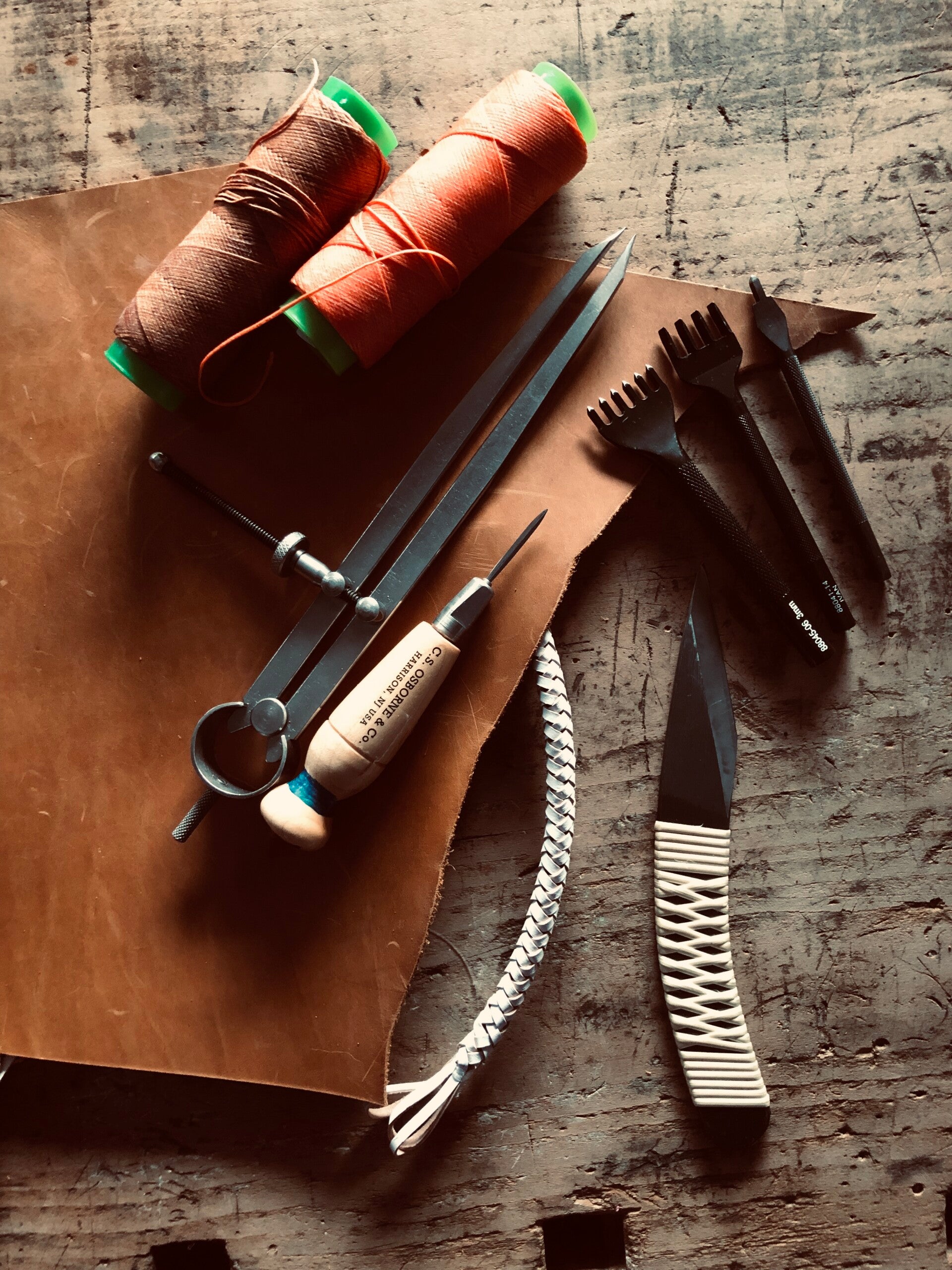 Je brengt in principe je eigen leder en fournituren mee. Heb je toch iets nodig, dan kan je basisleder en materialen in het atelier aankopen — handig wanneer je midden in je project zit.