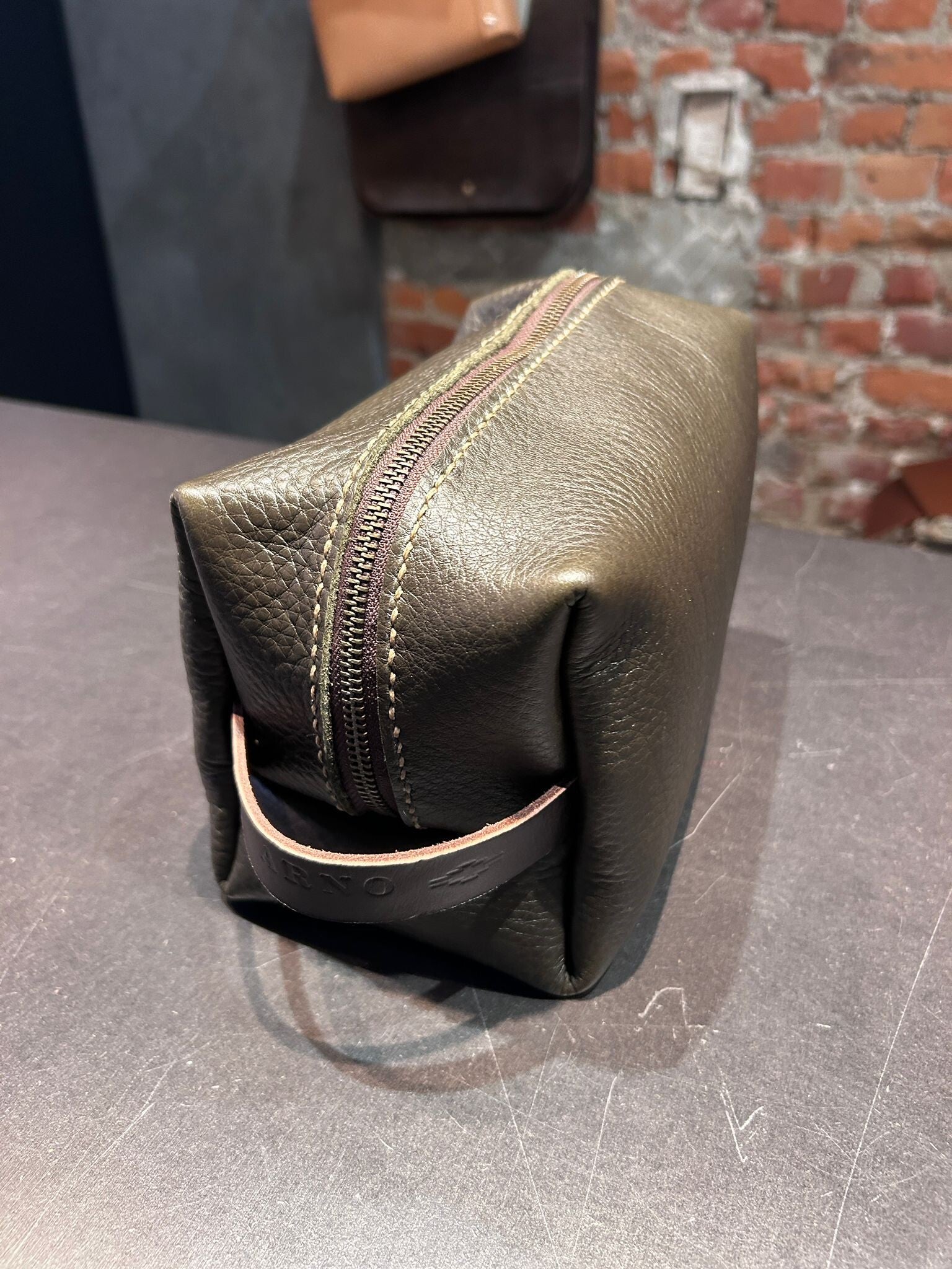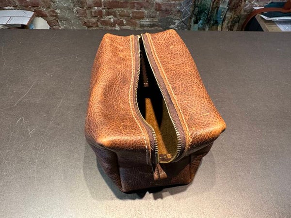 Een handgemaakte leren toilettas — stevig, praktisch en tijdloos van vorm.