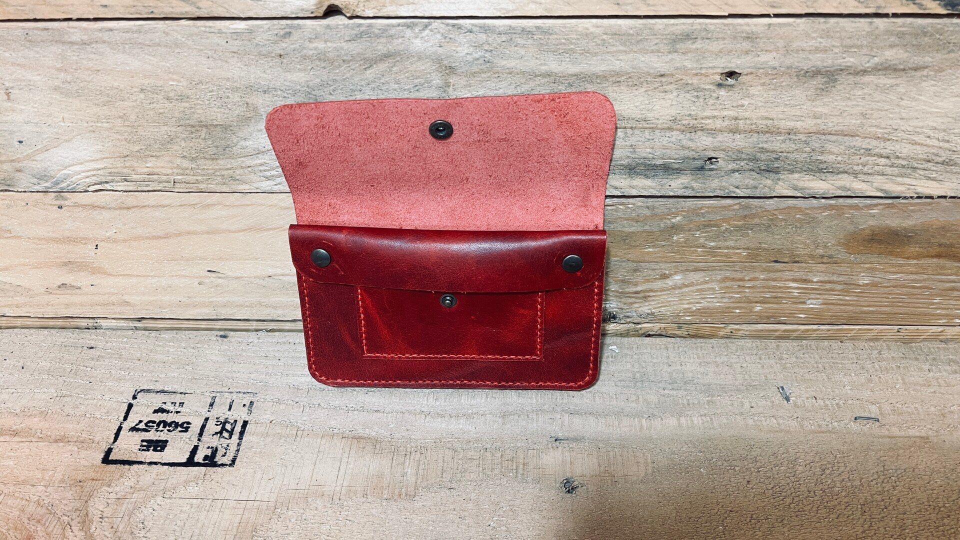 Een handgemaakte leren portemonnee (± 16 × 9 cm) — compact, stevig en tijdloos.